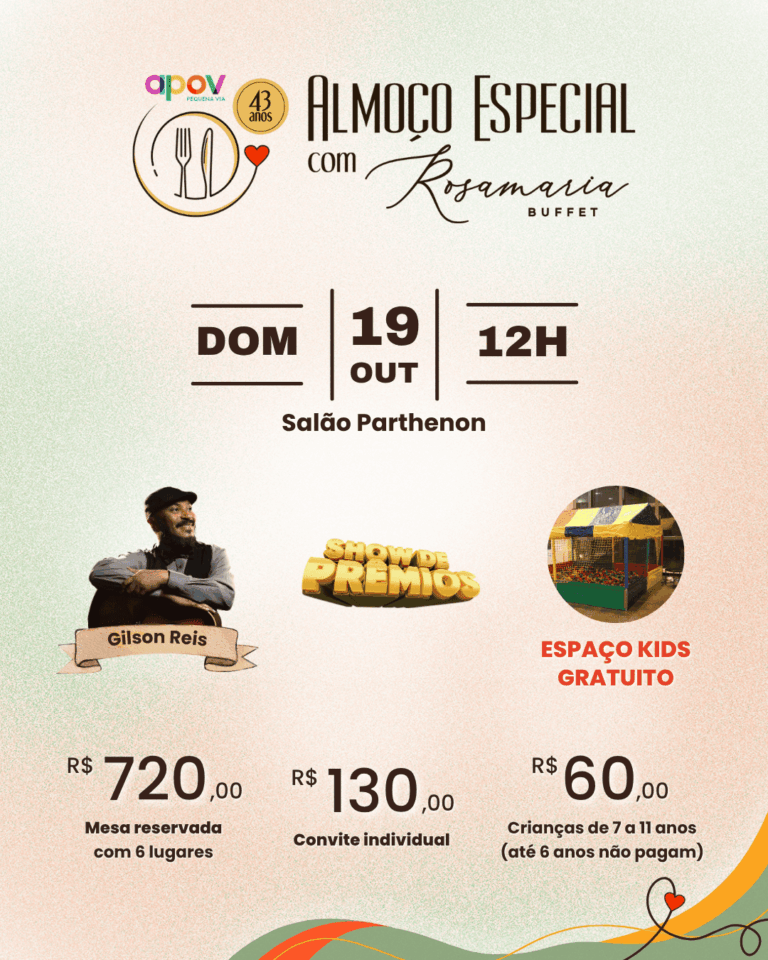 E é com essa missão de amor ao próximo que a APOV convida você para o Almoço Especial com o Buffet Rosamaria, no dia 19 de outubro, a partir do meio-dia, no Salão do Parthenon.